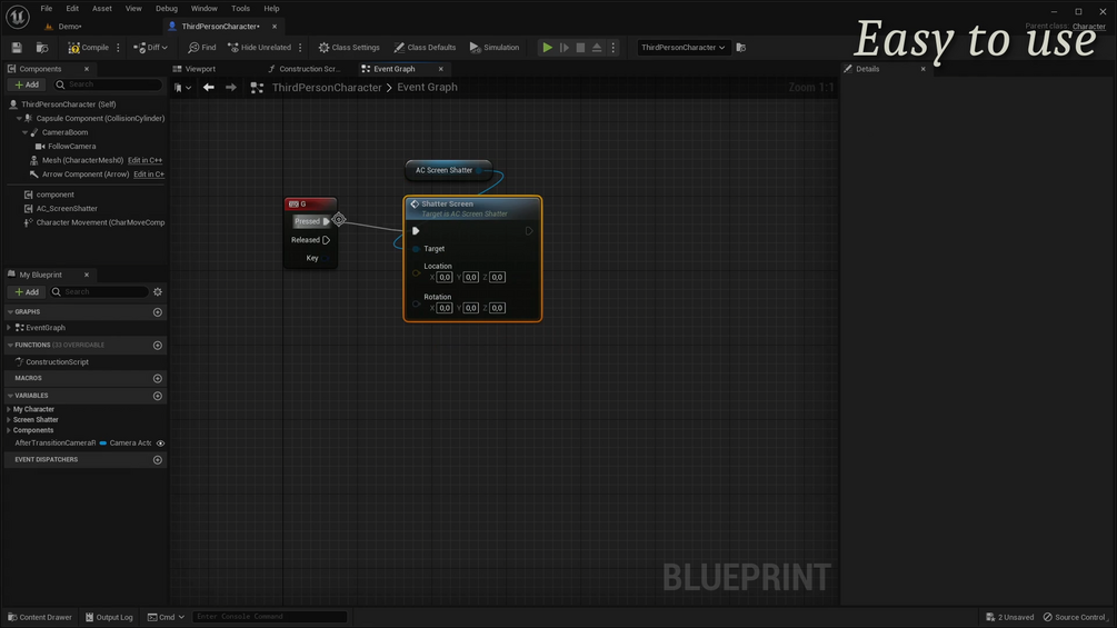 - Easy to use. Add Screen Shatter Component to your actor, call a fonction and that's it !